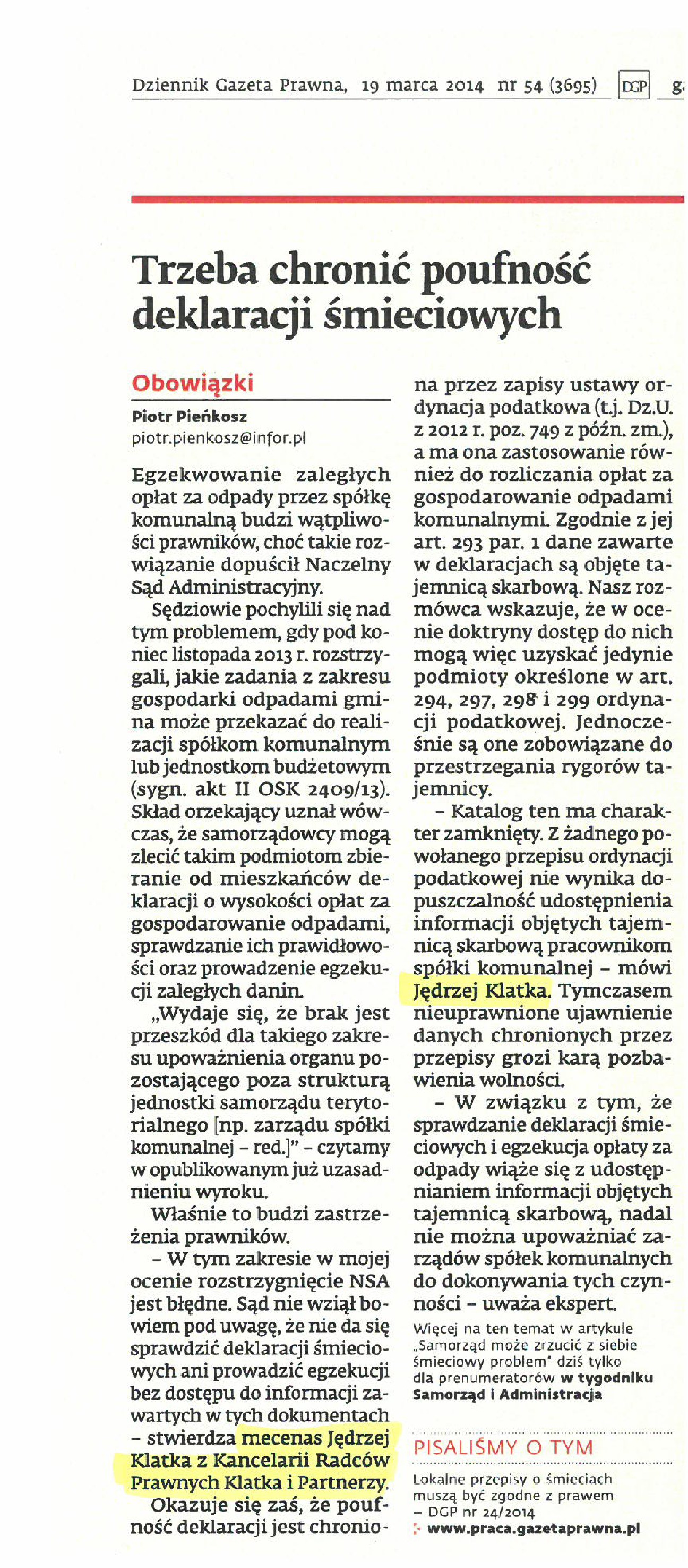 Na łamach Gazety Prawnej, radca prawny Jędrzej Klatka, udzielił porady prawnej w artykule pt. Trzeba chronić poufność deklaracji śmieciowych. Artykuł dotyczy egzekucji zaległych opłat przez spółki komunalne oraz zakresu dostępu do informacji o tych zaległościach.
